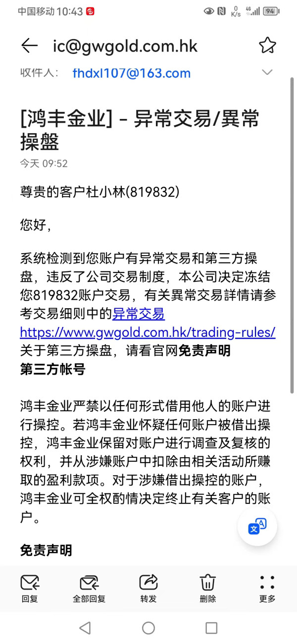 请大家切记不要做鸿丰平台-香港会员050号行员-说什么3分钟内不能平仓-3分钟内平仓就算异常交易。不给出金要扣除盈利。太黑了。